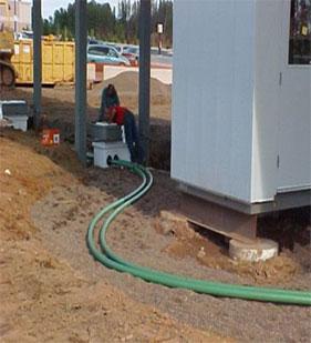 Vapor return lines should have a slope of 1/4" per foot and never less than 1/8" per ft. back towards the tank farm, unless in-line joints such as elbows are to be used and trench corners should have a radius of 5ft (1.5m). A recommended 6" (15cm) bed of backfill material should be laid underneath the pipe prior to installation and there must never be voids under or around the pipe.