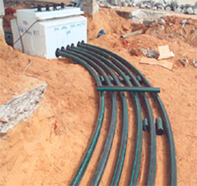 Make sure the site is prepared and ready. The tanks and sumps should be in place. Pipe Burial Guidelines recommended burial depth of UPP pipe is a minimum of 12" (300mm). All trenches should be sloped back towards the storage tanks. The fall back (slope) for all pipework to the tank chambers should be a minimum of 1/8" per foot or 1m every 100m. This may vary to meet local requirements.